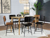 With a hint of ranch inspiration, the design of this five-piece counter height dining set is a brilliant choice for an easy, casual living space. Indulge in a calm vibe with a set anchored by a natural finish sheesham table featuring a spacious rectangular top and tapered, rounded legs. A dark apron with geometric design detail adds an exotic effect. Mid-Century Modern influence adds to four comfortable counter stools with scoop seats and a thick back, both with horizontally channeled leather upholstery. Metal framing features iconic retro slender rounded, splayed legs.