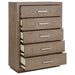 Chrome finish bar pulls add a touch of shine to the neutral barley brown finish of a modern five-drawer chest. Delivering ample storage with a compact footprint, the chest features a streamlined silhouette with mitered trim that creates a sense of depth. The top provides an easy spot for decor or a jewelry box that brings a personal touch. The soft wood grain finish of the chest complements in a variety of bedroom settings, making this a versatile choice for your home. The look is complete with a recessed base that provides a touch of height and airy presence.
