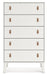 Dare to take minimalism to the max. This chest of drawers has an air of sleek simplicity thanks to its white painted finish with subtle replicated wood grain. Magnificently mod splay legs are a compelling complement to the streamlined design. And with two sets of faux leather drawer pulls that allow you to customize the chest to suit your space, there's no doubt about it: This contemporary piece is sure to become a classic.