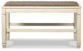 The beauty of this upholstered dining bench is something to savor. Serving up comfort and flair, this generously scaled counter-height bench entices with a cushioned seat covered in a heavy woven fabric that complements the antiqued white finish.