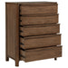 Add stylish storage in a compact footprint with this transitional five-drawer chest. Perfect for the bedroom, it boasts a rich walnut wood veneer that adds warmth to the elegance of natural grain patterns. Fingertip pulls are gently curved, creating texture and dimension for the front of the case. The chest includes rounded corners and decorative feet, adding fresh style to your bedroom or walk-in closet. Add a jewelry box or framed photo to the top to bring personality and stylish flair. Key Features: • Enhance your bedroom with the handsome profile and storage of a transitional five-drawer chest • Chest features rounded corners and gently curved fingertip pulls for easy operation • Walnut wood veneer lends warmth and creates a touch of texture with natural grain patterns • Top drawer is complete with dark brown felt lining, offering easy protection for delicate items • Drawers feature cedar lining that helps to protect against pests and provides excellent quality