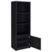 This contemporary media tower combines functionality and modern design in a sleek black finish. Built from durable engineered wood with a scratch-resistant laminate veneer, it features three open shelves for organizing media devices, books, or decor. A bottom cabinet offers concealed storage to keep clutter at bay. Its tall, clean-lined silhouette provides vertical storage, perfect for maximizing space in living rooms, home offices, or entertainment areas. Key Features: • Modern media tower in a sleek black finish • Three open shelves for versatile storage and display • Bottom cabinet offers concealed organization space • Scratch-resistant, eco-friendly laminate veneer surface • Crafted from engineered wood for lasting durability • Compact, tall design ideal for small or narrow spaces